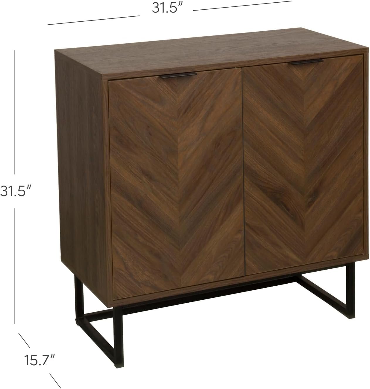 The Nathan James Enloe Modern Sideboard Buffet Storage Accent Cabinet combines rustic walnut herringbone doors with a sleek black matte metal base for a stylish, modern look. Its adjustable and removable shelves offer versatile storage, making it perfect for entryways, hallways, kitchens, or living rooms. Durable and free-standing, this accent cabinet not only enhances your decor but comes backed by a lifetime manufacturer warranty for peace of mind.