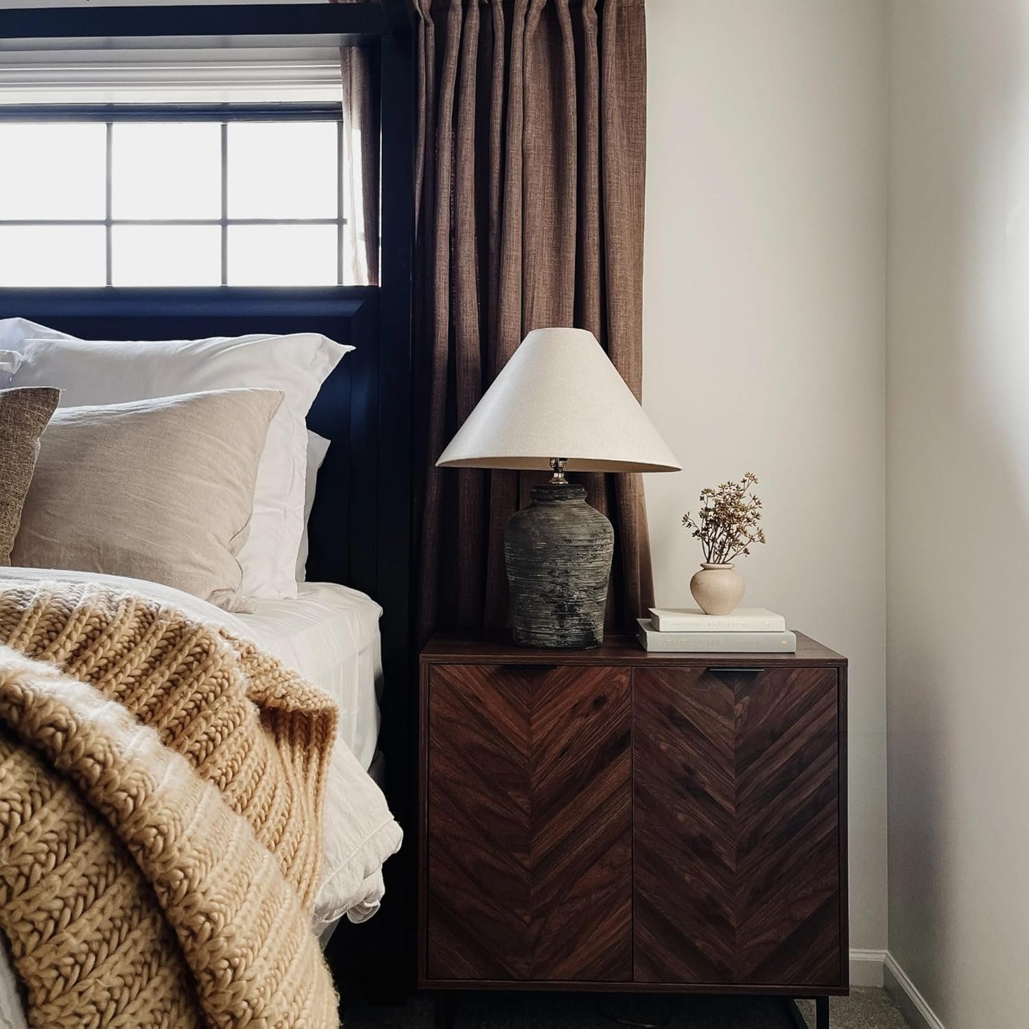 The herringbone doors are the first thing guests notice. The walnut tones vary slightly across the surface, mimicking real wood grain in a way that photographs beautifully and pairs effortlessly with both modern and farmhouse decor. We placed our sideboard cabinet in the hallway between our living room and kitchen, and it ties the two spaces together visually without clashing with either our gray sofa or our white shaker cabinets. The black metal base adds just enough industrial edge to keep it from feeling too traditional, and the slim profile means it doesn’t crowd the narrow passage.