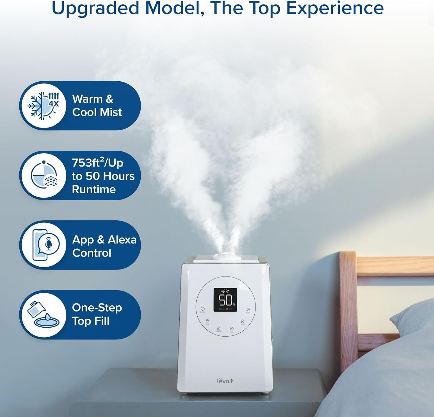 Yes—the smart humidifier we rely on every day delivers consistent, whole-room humidity without the fussy maintenance or noise issues we experienced with cheaper models. The LEVOIT LV600S handles large bedroom spaces up to 753 square feet, which fits most US master bedrooms and open-concept living areas. App control and scheduling make it easy to maintain ideal humidity levels without manual adjustments, and the hybrid warm and cool mist options adapt to seasonal comfort needs.